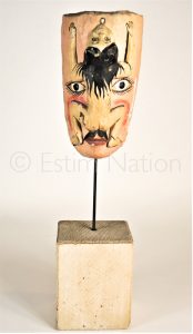 Masque décoratif érotique en bois sculpté et peint. Monté sur un pied en métal s'insérant dans un socle en résine.