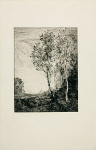 Acquaforte. mm 320x235. Foglio: mm 520x340. DELTEIL, MELOT C5. Stato finale dopo la cancellazione del testo in basso. Comparsa per la prima volta nell'album Sociétés des Aqua-Fortistes Eaux-fortes modernes Oeuvres inédites et originales, pubblicato da Cadart e Luquet, Paris 1862-1863. Bella impressione su carta vergellata con filigrana Annonay. Ottima conservazione, ampi margini.
