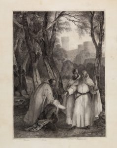 Carboncino. mm 510x405. Sotto la linea di contorno che riquadra il soggetto scritti a matita i nomi dei personaggi della scena. Disegno originale preparatorio per la litografia corrispondente facente parte dell'opera: Soggetti tratti dal romanzo storico dell'Ivanhoe di Walter Scott. Composti e disegnati da Hayez. Milano 1828-1831, n° 4 fascicoli, con coperta, contenenti 6 stampe litografiche ciascuno, per un totale di 24 stampe che illustrano appunto l’Ivanhoe, con cui l’editore Ferrario aveva iniziato a pubblicare a Milano nel 1822 la traduzione italiana dei romanzi di Walter Scott. Le sei tavole del primo fascicolo furono presentate all’esposizione di Brera del 1828. Il grande successo, dovuto soprattutto alla constatazione dell’altissimo livello tecnico e formale, è testimoniato tra gli altri da Robustiano Gironi, che nell’articolo sulla Litografia milanese esprime il più entusiastico consenso per le illustrazioni dell’Ivanhoe che "non hanno che invidiare alle più belle opere uscite dalle oltramontane litografie [..] l’Hayez e per lo stile e per l’effetto delle tinte e dei chiaroscuri e pel facile maneggio della matita è tra i nostri disegnatori forse colui che nel genere delle composizioni storiche e figurate potrà meglio raggiungere la meta". L’enorme diffusione (nonostante il prezzo elevato) fu favorita dal fatto che stampe di così alto livello artistico si riferivano al più grande successo narrativo del momento. Hayez litografo: la serie dell'"Ivanhoe" e altre prove litografiche, a cura di M. Jona, Milano 1990. Alcuni piccoli restauri con reintegrazioni in corrispondenza di fori causati da parassiti della carta.