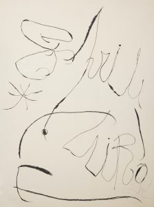 Litografia in nero. mm 880x710. Firmata e numerata a matita in basso ai lati. Es. n. 49/50. Copertina dell’album L'esprit de Mirò pubblicato a Parigi nel 1957. -