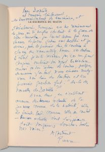 “Mon cher François, tu te rends à Oyonnax... ne crois-tu pas que ce serait l’occasion d’annoncer publiquement que ton vœu le plus cher sera exaucé ? Je t’envoie ci-joint un exemplaire de l’édition publiée en 1945 à Genève du Sacrifice du matin. Tu y trouveras d’humbles photos prises alors qui peuvent t’aider à retrouver la couleur de ces jours... bien fidèlement”, Paris, 31 octobre 1983, 2 pp. in-4 sur papier à en-tête “Le Général de Bénouville”.