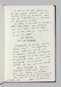 BEAU TEXTE DE JEAN DUTOURD SUR LA RELIURE, SOUS LA FORME D’UN TRÈS LONG ENVOI.