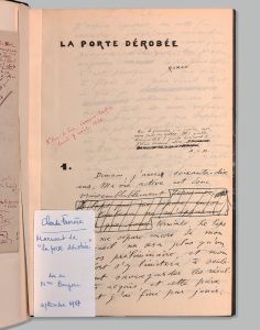 “Claude Farrère, Manuscrit de La porte dérobée, don de Mme Bargone, septembre 1987”.