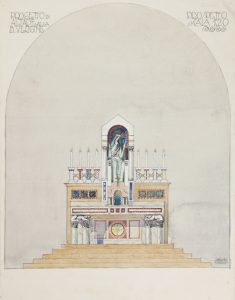 Matita e acquarello. mm 480x375. Titolo e scala in alto ai lati. Firmato in basso a destra. Progetto di altare in stile Déco proveniente dagli archivi delle maestranze artigiane del marmo di Pietrasanta. Gino Robuschi fu un architetto attivo a Parma che curò tra l'altro l'ampliamento di Via Mazzini. Di lui tratteggiò un entusiastico profilo Giovannino Guareschi ne “La Fiamma” del 1932 dopo averne visitato lo studio. Ora in: G. Guareschi, Bianco e Nero. Giovannino Guareschi a Parma 1929-1938, Milano 2001.