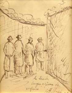 Penna e inchiostro bruno. mm 162x120. In basso a penna: “la strada larga e piena di sorprese. Ottone Rosai 42”. Montato in passe-partout.