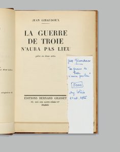 “Jean Giraudoux, La Guerre de Troie n’aura pas lieu, 5.000 (fr.) chez Loliée, 1er oct. 1985”.