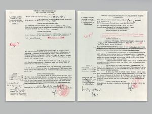 (1) : “Citation à témoin devant le Haut Tribunal Militaire... à la requête de Monsieur Raoul Salan, actuellement détenu à la Prison de la Santé (...) donne citation à M. François Mitterrand (...) à comparaître et se trouver le mardi 15 mai 1962 à l’audience”..., donné en personne à François Mitterrand par l’huissier qui signe et ajoute deux mentions au tampon rouge COPIE et comme il est conforme à l’original, 1 p. in-folio.