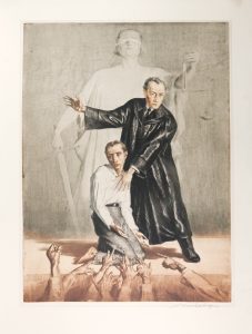 Acquaforte a colori. mm 630x450. Foglio: mm 780x590. Firmata a matita in basso a destra. Questa incisione costituisce quasi il pendant dell’altrettanto celebre Der Arzt, das Mädchen und der Tod, eseguita dal controverso artista tedesco nel 1920. Come in quella il medico strappa eroicamente la donna alla morte, così qui l’avvocato buono difende l’imputato dalla furia della folla. Saliger aveva studiato a Vienna sotto Rudolf Jettmar Ludwig Michalek e Ferdinand Schmutzer. Nel 1920 fu nominato egli stesso professore. Negli anni Venti sviluppa maggiormente la tendenza al Déco. Nel 1930 andò a Parigi a perfezionarsi nella pittura ad olio con Fernand Léger e Amédée Ozenfant. In seguito i suoi soggetti di nudo come il famoso Giudizio di Paride (1939) furono destinati a divenire modelli perfettamente corrispondenti alle ideologie estetiche del nazionalsocialismo e vennero spesso esibiti alle mostre del Reich. Minima abrasione nell'inciso in basso a sinistra, leggero alone da esposizione alla luce qualche mm intorno all'impronta, altrimenti ottima conservazione.
