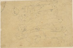 Matita di grafite su carta velina ingiallita. mm 128x82. Siglato “TS” in basso a destra. Pubblicato e catalogato in: Mostra di disegni di Telemaco Signorini, presentazione di P. Bucarelli, Galleria Nazionale d'Arte Moderna, Roma 1969, p. 31, n. 155, ill. Velina incollata parzialmente su un cartoncino di supporto. Lievi danni.