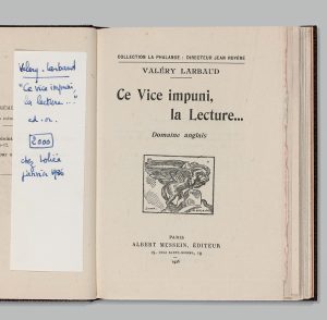 LARBAUD, Valery. Ce vice impuni, la lecture... Domaine anglais. Paris, Albert Messein, 1925.