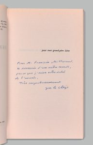 Pour M. François Mitterrand, ce souvenir d’un autre monde, parce que j’aime votre idée de l’avenir, très respectueusement, J.M. Le Clézio.