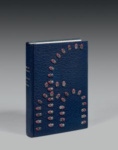 Maroquin bleu, large décor de pin’s formant le chiffre “FM” de François Mitterrand sur le plat supérieur, non rogné, couverture et dos conservé.