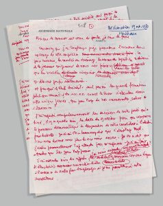 “Puisque le moment est venu de parler, je vais le faire (...) la paix menacée, la montée du chômage (...) le désarroi de la jeunesse exigaient de nous une présence dans les luttes que les rivalités internes risquaient d’amoindrir”..., feutre rouge, très raturé, 2 pp in-4 (220 x 160mm) ;