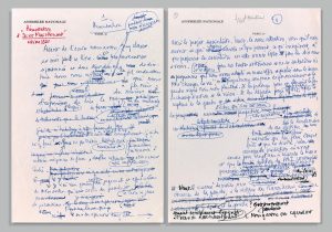 (9) : 2 liasses de papiers non identifiés et pour la plupart fragmentaires. Encres bleue et noire, papier à en-tête de l’Assemblée nationale, souvent très corrigé, en tout 68 pp. in-8