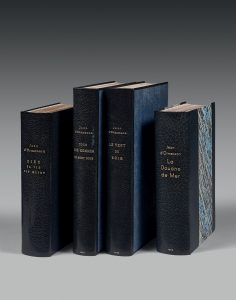 Maroquin bleu, tranches dorées sur témoins, dos long, couverture et dos conservés.