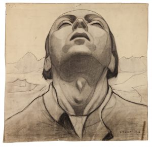 Carboncino mm 375x390. Firmato e datato a penna in basso a sinistra. Al retro abbozzo di busto e di mano. Ispirato ritratto dall'aura mistica e metafisica, forse raffigurante l'artista stesso. Autodidatta, Carlo Zocchi si formò studiando l'arte del Trecento e del Quattrocento italiano. Negli anni Venti si avvicinò al clima novecentista, filtrando suggestioni dalla metafisica e lasciandosi influenzare anche dalla pittura di Mario Sironi, di cui si avverte l'eco in alcuni dipinti dedicati a soggetti urbani. Negli anni Trenta entrò in contatto con la pittura del chiarismo milanese. Fori di spilli o puntine e qualche strappetto ai bordi. Traccia di piega verticale.