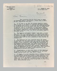 “Personal, Cher François [autographe], Upon returning from my first visit to Egypt at President Sadat’s invitation, I would like to share my main impressions with you. 1. It is clear to me that the present Egyptian leadership is firm in its desire to continue the peace process (...) In conclusion, this, my first visit to a country which for years was Israel’s greatest ennemy, was an extremely moving and important experience (...) I found a public which bears its poverty with enormous restraint and which wants peace very much. Peace with Egypt seems assured”..., 3 pp. in-4 (280 x 220mm)