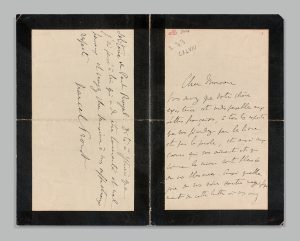 “Cher Monsieur, vous savez que votre chère existence est indispensable aux Lettres françaises, à tous les esprits que vous fécondez par le livre et par la parole, et aussi aux cœurs qui vous aiment et qui, comme le mien, sont blessés de vos blessures (...) quelle joie de vous voir sortir magnifiquement de cette lutte où vous avez excellé (....) dont devraient être dispensés les poètes dont les combats sont autres (...) chez vous quelque aide de vos aïeux doit descendre à l’heure du combat et vous apporter quelque appoint magique de valeur et de témérité (...) nous ne voulons plus que vous continuiez à hazarder votre vie et à vivre en beauté la vie de Byron”..., 4 pp. in-8 (175 x 100mm), sur papier de deuil