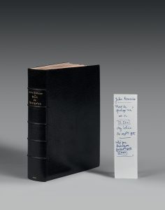 Maroquin noir, dos à nerfs, tranches dorées sur témoins, couverture et dos conservés, non rogné.
