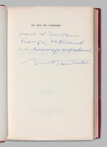 Pour l’écrivain François Mitterrand, en hommage confraternel, M. Tournier.