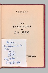 “Vercors, Les Silences de la Mer, ed. or., 1.250 (fr.) chez Coulet, 21 septbre 1988”.