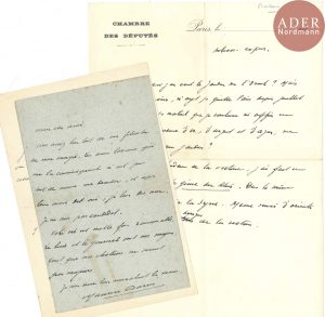 naturel que je voulusse m’offrir un plaisir, écrire un poème d’or, d’argent et d’azur, me donner un concert au jardin ? » Il rappelle qu’il a fait un cours à l’Université de Strasbourg « sur le Génie du Rhin. Dans le même esprit, je veux parler de la Syrie. Même souci d’orienter les imaginations vers les horizons de la victoire ». On joint 2 L.A.S. de Barrès, renonçant à être candidat, et remerciant pour des « memoranda » ; 2 lettres de sa femme Paule (1925-1930) ; et 2 L.A.S. de son fils Philippe Barrès à Émile Buré (1930), à propos de l’œuvre de son père