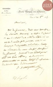 Jean-Jacques CHAMPOLLION-FIGEAC (1778-1867) bibliothécaire et érudit, frère de l’égyptologue. L.A.S., Paris 30 octobre 1845, à M. Aubenas ; 1 page in-8 à en-tête École Royale des Chartes, adresse. « Mr de Sinner dont vous connaissez...