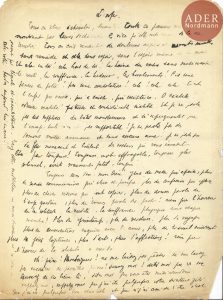 Max JACOB. 2 manuscrits autographes ; 1 page in-fol. (bas un peu effrangé) et 1 page oblong in-4. Méditations inédites. — L’enfer : « Tous ces êtres échevelés, suants ! Toutes ces pauvres nudités montrant par leurs déchéances...