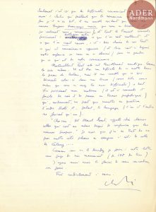 remercie pour la critique de son livre. « Chef d’œuvre, toutefois, me semble un bien grand mot. Certainement je crois avoir écrit un bon roman (sans quoi je n’aurais pas publié) mais […] je pense plutôt que, comme pour le vin, il faut attendre un peu pour voir si [les œuvres] vieillissent bien ». Il ne sait comment répondre à ses questions : « Se commenter soi-même est passablement ridicule. […] Mon propos est résolument et essentiellement réaliste. Un peu, si vous voulez, comme celui des cubistes qui ont essayé de montrer en même temps un objet sous divers angles et ses divers aspects. Contrairement à mon ami Robbe-Grillet je pense que le roman consiste à raconter une histoire. Seulement c’est ici que les difficultés commencent car, contrairement aussi à Sartre qui prétend que le romancier en sait toujours plus qu’il n’en dit, il me semble évident que nous en savons toujours beaucoup moins que nous en disons […] et tout le travail consiste précisément à distinguer entre ce que l’on sait réellement et ce que l’on croit savoir. […] Naturellement tout cela est ambigu. Comme la vie même »… Son réalisme – qui, « évidemment ne peut que remettre en question l’ordre établi et, partant, le langage – doit probablement déconcerter ses lecteurs…