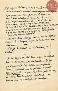 Paul VALÉRY. L.A. (minute), [27 juin 1916, à Pierre Louÿs] ; 2 pages in-8. Ce fragment renvoie à une longue lettre de conseils et de mise au point de Louÿs pour ce qui deviendra La Jeune Parque : « J’ajoute (pour Poëtique) que ces 3...