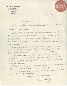 d’une petite lettre sur les mythes de Paul Valéry, illustrations par George Barbier (A. Blaizot, 1928). [2 novembre 1925]. Il part pour Bruxelles, et aurait voulu causer du projet ; quant à sa candidature : « Je vous dis (entre nous, pour ce soir) que je change de place [de sa candidature au fauteuil d’Haussonville, à celui d’Anatole France]. On m’y pousse et presque on m’y contraint. Je n’avais plus aucune chance, sur l’autre position »…Vendredi [5 février 1926]. Il se plaint de sa santé et de ses insomnies ; il doit faire une conférence à Lyon, et aurait voulu avant de partir parler à Barbier « au sujet du Centaure. Êtes-vous arrivé à vous accorder avec Bl[aizot] ? – Vous m’aviez demandé une lettre sur la mythologie de 1200 mots environ, pour le 20 mars. Tout ceci est-il convenu avec lui ? Que donne-t-il en fait d’argent et d’exemplaires ? Je n’ai vu qu’une fois cet éditeur, et je n’ai pas infiniment à me louer avec lui. Mais enfin nous avons coutume de travailler pour le diable »… La Polynésie (Giens) Samedi [27 février 1926]. Au sujet de ses conditions et des difficultés avec Blaizot : « Ce n’est pas lui qui paye, c’est l’acheteur. Ce que je ne veux pas, c’est stipuler un prix en francs – c. à d. un prix indéterminé. Si le franc baisse, l’éditeur peut élever son prix de vente ; il est juste que nous suivions le mouvement. Je maintiens donc mes conditions qui ne sont que naturelles – 5% sur le prix de toute édition (prix fort). C’est 6 semaines de travail que je devrai intercaler dans le travail en train qui est déjà accablant pour moi »…