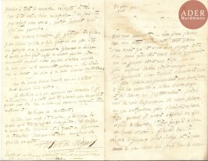 Alfred de VIGNY. L.A.S., 30 novembre 1845, au vicomte Jehan de Clérambault, au château de Kimkampois près de Liège ; 4 pages in-8 très remplies, adresse avec cachet de cire rouge (légère mouillure sur la 1ère page). Belle lettre à son...