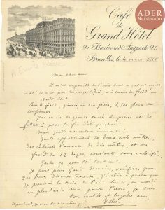 Auguste de VILLIERS DE L’ISLE-ADAM (1838-1889). L.A.S., Bruxelles 4 mars 1888, [à Émile Pierre] ; 1 page in-4, en-tête et vignette du Café du Grand Hôtel (fentes réparées au verso au papier gommé). Il est allé en Belgique donner des...