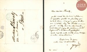 force à garder ma chambre et le lit » ; il l’assure de son attachement et de son admiration. 21 mai [1850]. Il regrette de « devoir reporter une si agréable partie de famille qui m’est si chère, mais je ne puis décliner une invitation chez M. Reiset ». Il prie de l’excuser auprès de sa femme et de sa petite fille…