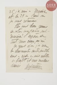 Antonia Mercé y Luque, dite la ARGENTINA (1890-1936) danseuse et chorégraphe espagnole. 2 L.A.S., 1928-1930, à un cher ami ; 2 et 3 pages et demie in-8 à en-tête d’hôtels (trous de classeur). Barcelona, dimanche 22 [1928]. Elle évoque...