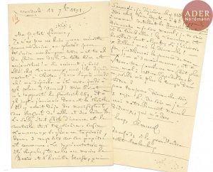 Membrolle] 3 mai 1891, sur la banqueroute de son banquier Jouanno : « Où allons-nous, ma pauvre femme ? C’est la ruine, ma petite chérie ! – Que vais-je faire ? je ne puis pas rester dans cette situation-là ; c’est la déveine sur toute la ligne. […] il faut que nous changions de vie ou que je trouve un équivalent – mais quoi ? quoi faire ? Nous ne sommes pas heureux, maman »... Tours 6 juillet [18]91, sur l’examen d’André pour l’entrée au Prytanée de La Flèche : « Ce matin, nous sommes partis, le petit Loulouloup et le gros Papipopoussof, sur le coup de 6 h. 1/2, dans une roulante à Barateau, après avoir lampé un bouillon gras, un pain-fromage et une verrée de vin ». André passe seul son examen à la Préfecture, « sous la surveillance d’un assez jeune capitaine » : thème latin et version latine, dictée et analyse logique : « « il s’est foutu dedans pour des subjonctifs […] Enfin, l’ensemble ne m’a pas paru trop mal et le capit[ain]e m’a dit que c’était convenable. Quant à l’analyse logique il y a là tant de mots dissonnants que ça m’a rappelé un peu Le Rêve que j’aime beaucoup pourtant ; je n’y comprenais rien, le cap[itain]e non plus, je crois, mais il voulait avoir l’air ; enfin, à la grâce de Dieu, qui devrait bien un peu penser à nous ici-bas, à moins qu’il n’ait, à notre endroit, des vues superbes dans l’avenir. Espérons & attendons, mais pas de charbon, pas de revolver, pas de noyade en chœur, aimons-nous. De 4 à 5, le jeune fœtus fait son th[ème] et sa version allemande »… [La Membrolle] 13 juillet 1891. « Et d’abord, de la prudence demain. Si vous avez placé le drapeau français sur le balcon, assurez-vous-bien qu’il est solidement fixé à la grille ; si ça allait dégringoler dans la rue, ça nous ferait des affaires d’état. – Ne bougez pas de la maison, – voir quoi ? des foules ? Ce n’est pas drôle, et ce sont ces jours-là qu’un tas de salops cherchent à pénétrer dans les appartements »… Longues explications sur les démarches à faire et les gens à solliciter pour obtenir l’admission d’André au Prytanée de La Flèche… Puis sur son jeune neveu Fernand Jacmart : « Ta mère reçoit Fernand comme si c’était Guillaume II ; les quartiers de viande paraissent et disparaissent, on ne les voit qu’une fois à table ; si elle n’était pas sourde comme un pot, je lui dirais que je ne comprends rien à ces dépenses exagérées, Fernand est simplement Fernand et si heureuse qu’elle puisse être de recevoir son petit-fils, je trouve que c’est de l’exagération »… [La Membrolle] 18 juillet 1891. Il s’irrite contre son fils André : « si tu te figures qu’il pense à toi ou à moi ! Il ne pense à rien, il ne communique jamais rien ; il peut avoir, si l’on insiste, un petit accès de sensibilité nerveuse, mais ça passe très vite : il n’aime rien, et rien ne vient jamais de là, par la réflexion et le désir d’aimer ; ce cerveau est vide. Enfin, maman, voici la situation : 1° s’échiner, faire des kilos de platitudes pour tâcher de pousser des enfants absolument en retard ; 2° cette salle affaire J[ouanno] qui me tourmentera jusqu’à ce que ce soit fini ; 3° pas assez d’argent ; 4° mon travail se débattant au milieu de toutes ces préoccupations ; 5° éloigné de toi trop souvent ; 6° et malade, car je sens que j’ai un tas de choses qui couvent et éclateront un jour ou l’autre. – Tout ça est si triste et quand tu es là, je suis moins malheureux »... [Paris] 18 septembre 1891. Il a eu à temps son fauteuil : « à 7 h. juste j’arrivais devant le théâtre. Il y avait déjà des manifestants, des sergents de ville et des badauds. La salle était faite d’avance et le contrôle était très sévère. Enfin Lamoureux se glisse en tapinois, donne 3 coups secs sur son pupitre et commence. La représentation a été superbe »… Courses diverses ; dîner à Chatou chez les Chevillard avec les Lamoureux… Consultation à la clinique du Dr Maurel : « il a été épaté, disant que ça allait remarquablement mieux ! Tu penses si je suis content ! Il en a profité pour corser le régime et je le reverrai d’ici à 3 semaines ou un mois, – quand le nouveau régime aura opéré. […] à 6 h. je serai chez Lamoureux pour dîner et nous irons tous les 3 à Lohengrin. J’ai idée que ce sera chaud ce soir. […] Samedi je déjeune chez Wilder et dîne chez Van Dyck – à 4 h. j’apprends à maman Costallat la Bourrée fantasque ! Dimanche – je sors Marcel »… Correspondance (91-33, 91-53, 91-56, 91-58, 91-82). Ancienne collection Francis Poulenc.