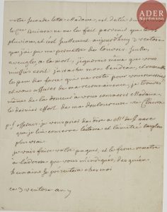 Bordeaux ; 1 page in-4, adresse. Émouvante lettre de la fin de sa vie. Le citoyen Buisson (éditeur de ses Mémoires) ne lui a fait parvenir sa lettre que très tardivement, et elle vient seulement de l’ouvrir : « Seulle, aveugle, à la mort, j’ignorais même que vous m’ussiés ecrit : j’arrache mon bendeau, et rassemble le peu de force qui me reste pour vous remercier, et vous assurer de ma reconnaisence ; je trouves même de la douceur à vous consacrer Madame, le dernier effort de ma douloureuse vie ». Elle la prie de dire à M. de Saint-Marc « que je lui conserve l’estime et l’amitié la plus vrai »... Ancienne collection Sacha Guitry (21 novembre 1974, n° 18).