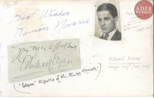 Edward ELGAR (1857-1934). P.A.S. collée sur un feuillet d’album oblong in-8. Fin de lettre découpée : « Your ever affectionate Edward Elgar » ; collée au-dessous d’un autographe de l’acteur Ramón Novarro (« Best Wishes », avec...