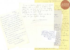 MUSIQUE ET SPECTACLE. 6 L.A.S. [à Marguerite Steinlen]. Henry Barraud (1955, sur Gabriel Marcel musicien), Pierre Bertin (1955, au sujet d’une pièce qu’il n’a pas réussi à placer), Henri Dutilleux (sur carte de visite), Georges Godebert...