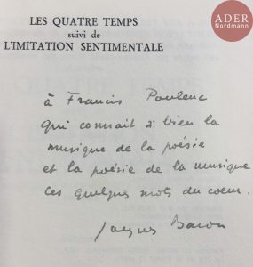 [Francis POULENC (1899-1963)]. 3 ouvrages à lui dédicacés. Jacques BARON. Les Quatre Temps, suivi de L’Imitation sentimentale (Seghers, 1956) ; in-12, broché. Envoi autographe : « à Francis Poulenc qui connaît si bien la musique de la...