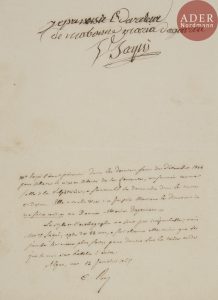 Marguerite SAQUI (1786-1866) acrobate et danseuse de corde. P.A.S., [décembre 1864] ; ¼ page in-8. Très rare. En deux lignes d’une écriture malhabile, et dans une syntaxe approximative, Mme Saqui écrit : « Je pri misie le deirecteur de...