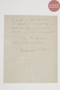 Valentine TESSIER (1892-1981) actrice. L.A.S., Cannes [été 1932] ; 1 page et demie in-4. Au sujet de l’adaptation cinématographique de Madame Bovary par Jean Renoir (1933), où elle va jouer le rôle-titre. « Je suis sûre que Pierre Renoir...