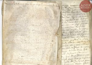 de l’abbaye de Saint-Martin d’Ostun en Bourgogne, concernant la vente de terres, bois et vignes (1458 ; plus copies sur papier du procès concernant les terres de l’abbaye, sous l’autorité et la conduite de Pierre de Choisy, seigneur de Ganay). Transaction entre Jean et Raymond Salayronis concernant de domaine de Fraixinet (1460). Attribution d’une cure à l’église paroissiale de Saint-Martin de Astellis par Antoine, évêque de Lisieux (1478). Vente de la terre et seigneurie du Froult près d’Alençon, par Robert d’Angerville seigneur de Grandville, en faveur de Jacques de Silly, conseiller et chambellan du Roi (1486) ; plus 3 pièces concernant le procès entre eux devant le sénéchal d’Alençon sur les droits de la terre du Froult (1489).Vente de terre et bail par Jacques Agay à Jean de la Fertais (1496). Bail à ferme des moulins de Poussegards en Anjou (Deux-Sèvres) à Mathurin Binault, à charge de payer les années d’arrérages à dame prieure de la Fougeresse, signé par François Bourneau S. de Montaglan, lieutenant-général d’Anjou à Saumur (1571). Transaction entre les familles Duperier et du Bedat, concernant la succession du S. de Bondie (1574). Prérogative et bail du curé de Sainte-Colombe d’Orléans sur la propriété de plusieurs arpents de vignes à Saint-Martin du Loiret (1583). Litige sur la succession de la famille de Quevesoy (1578). Etc.