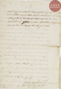Medicis ; 2 pages in-fol., adresse « A La Royne » (petite réparation au dos). Belle et rare lettre à sa mère Catherine de Medicis. « Madame je vous lesse a pansser layse que jay eue dantandre par Marc Antoyne [Seghizo, sieur de Bouges, premier écuyer tranchant de la Reine] de votre bonne santé et de voir la bonne souvenance que il vous plest avoir de moy aussy ny atil rien que je desi[re] tant que davoir le moyen de vous faire cervice […] quant ase quil vous plest me commander que jaye tousjours soin des afaires du roy mon oncle vous poves estre assurée que non seulement en sela mais en tout se que vous me commanderes il ne sera point de besoin de man faire souvenir et prinssipalemant estant chose que je desire tant que le roy monseigneur le recompance et croy madame que si veut faire bonnes eures que avec votre bon ayde vous feres quelque chose de bon »… Elle a donc fait à son mari « vos recommandations et luy ay dist de votre part se que vous maves commandé de quoy il vous remers[ie] tres humblemant et vous suplie de pancer que il ne desire moins vous faire cervice que s’il estoit votre propre fils »… Ancienne collection Karl Geigy-Hagenbach (Marburg, 30-31 mai 1961, n° 755).