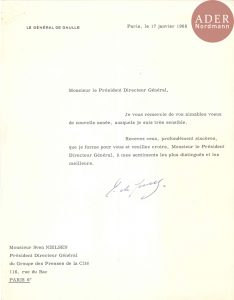 Charles de GAULLE (1890-1970). L.S., Paris 17 janvier 1968, à Sven Nielsen, président directeur général du Groupe des Presses de la Cité ; 1 page in-4 à son en-tête Le Général de Gaulle. « Je vous remercie de vos aimables vœux de...