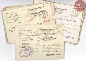 GUERRE 1939-1945. Environ 50 documents ; formats divers. * Ensemble d’environ 45 documents, archives de Charles Sockeel, journaliste du Nord de la France et homme de confiance au Stalag XC en Prusse orientale. 23 courriers ou cartes postales...