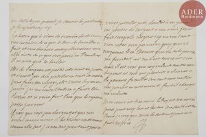 [évêque de Chartres, directeur de Saint-Cyr] ; 7 pages in-8 (lettre dictée à Mlle d’Aumale, les pages 6 et 7 autographes). Très belle lettre au lendemain de la bataille de Malplaquet, faisant le récit de ce combat mené dans les Pays-Bas espagnols par les troupes françaises, commandées par le maréchal de Villars, face aux troupes anglo-prussiennes. Bien que l’armée française fît retraite, elle infligea à ses ennemis des pertes considérablement plus importantes que les siennes, et empêcha l’invasion du pays. « Après bien de fausses nouvelles que nous receusmes hier des courriers des particuliers qui venoient aprendre la blessure ou la mort de leur maitre et qui nous assuroient que toute larmée etoit deffaite par une deroute generale, nous avons enfin apris ce matin par le courier de Mr le Mal de Boufflers qu’il y a eu une terrible action le 11 de ce mois, quelle a duré sept ou huit heures, se reprenant continuellement les postes les uns sur les autres, Mr le Mal de Villars y a esté blessé dès le commencement, et que lui Mr le Mal de Boufflers ayant pris le commandement de larmée a esté temoin d’une valeur dans nos troupes qui leur a donné lavantage plusieurs fois, mais qu’enfin il a falu ceder au plus grand nombre, nostre armée sest retirée en tres bon ordre sous le Quesnoy. Pas un soldat ne s’est debandé, ils n’ont point fait de prisonniers, nous avons plus de leurs canons et de leurs drapeaux qu’ils n’en ont des nostres, et ils n’ont pour eux que le champ de bataille qui leur est demeuré, et nostre retraite qu’ils n’ont osé troubler, on peut croire ce que dit Mr le Mal de Boufflers comme sy on lavoit vû soy même ». Elle énumère ensuite les blessures et pertes à déplorer : le maréchal de Villars a été gravement blessé au genou, le duc de Guiche à la jambe, le fils de M. de Dangeau et le marquis de Coëtquen ont chacun perdu une jambe, le comte Palaviccini a été tué, le duc de Saint-Aignan a été blessé à la tête. Elle ne sait rien du comte d’Aubigné. « Il se trouvera bien des morts et des blessez dont Mr le Mal de Boufflers ne pouvoit pas encore avoir de connoissance. On ne sauroit comprendre ce que cestoit que la nouvelle que nous avions receüe de Mr l’Electeur de Bavière qui nous mandoit que les generaux ennemis, et les nostres etoient en conference pour une suspention d’armes, le tems nous eclaircira de tout. Le Marquis de Gondrin est blessé et on ne trouve point Mr de Lambesc petit fils de Mr le Grand. Tous nos blessés sont au Quesnoi. Le Roy d’Angleterre etoit a laction avec la fièvre et a fait des merveilles. Tous nos officiers generaux ont parfaitement bien fait, et Mr d’Artaignan a eu trois chevaux tuez sous luy. Quelques uns disent que le prince Eugène est blessé, cela est incertain ». Elle a appris aussi « que le duc de Noailles a fait quelque chose dheureux en Catalogne »... Madame de Maintenon prend alors la plume, pour annoncer l’envoi d’une lettre sur ce qui s’est passé en Flandres. Son amie Mme de Dangeau est partie cette nuit en poste, sans argent ; M. Voisin lui en a prêté, et elle-même s’interroge : « Quoy que jaye peu dargent, et que jen aurai encore moins si les choses continuent comme elles sont, je nen suis pourtant pas a vingt pistolles près, devrois je en pareil cas prester de largent a une amie jen ai fait scrupule jusques icy ne voulant rien oster aux pauvres, quoy que je comprenne bien lhoneur que de tels procedes me feroient, car tout est tousjours sceu. Mais il est vrai que jay reduit toutes mes depenses et tous mes plaisirs a donner a de pauvres familles et surtout aux nobles. Mes proches en murmurant, faut il changer ma conduitte. Mon cœur est bien serré, le Roy est très resigné. Priez pour moi lun et lautre. Ma santé est très bonne. Je crois que Dieu la soutient pour me faire souffrir. »
