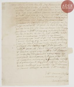 de lettres, elle est l’auteur de l’Heptaméron. L.A.S. « Marguerite », [avril-mai 1547], au cardinal Alessandro Farnese ; 1 page in-4, adresse au verso « A mon cousin et bon filz monsgr le cardinal Farnesse », sceau aux armes sous papier (légère mouillure). Très belle et rare lettre après la mort de son frère François Ier. « Mon cousin et mon bon fils Jay receue vostre consolatifve lettre a laquelle ne vous feray aultre responce sinon que vous aves perdu ung Roy quy portoit grande amour et reverence a nostre Sainct père [Paul III, né Alexandre Farnese] et quy vous aymoit bien fort. Mes nostre Sgr vous en a redonné ung [Henri II] qui je suis seure suivra les vertus du pere et sera heritier de lobeisance quil portoit au St Siege apostolique et pour le desir que jay heu toute ma vie de voir continuer cete amytyé. Je loue nostre Sgr Dieu quy a faite lalience de sa maison et de la vostre laquelle je tiens pour perpetuelle ». Elle témoigne de la gratitude du cardinal d’Armagnac pour les grâces reçues du Saint-Père « lesquelles jestime tant miennes que avesq luy en demoure a james obligee a toute vostre maison »… Ancienne collection du Président Robert Schuman (avec transcription de sa main, II, 24-25 juin 1965, n° 178).