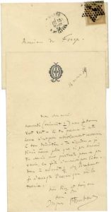 Lettre autographe signée, adressée à M. de Forges. 14 mars 1869 ; 1 page in-8°. En-tête à son chiffre. « Mercredi (minuit 1/2), nous fêtons Vert Vert. Si ta présence à cette heure n’est pas absolument nécessaire à ton ministère. Tu viendras. Je dirais même plus que si par hasard tu cherchais un prétexte pour ne pas venir, la fête n’aurait pas lieu. Donc à minuit 1/2 chez Bréhant. Je n’accepte d’excuse que le terrain. »