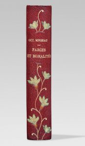 MIRBEAU (Octave). Farces et moralités. Paris, Bibliothèque-Charpentier, Eugène Fasquelle, 1904. In-12, bradel demi-maroquin rouge avec coins, filet doré, dos lisse orné d’une composition florale mosaïquée, tête dorée, non rogné,...